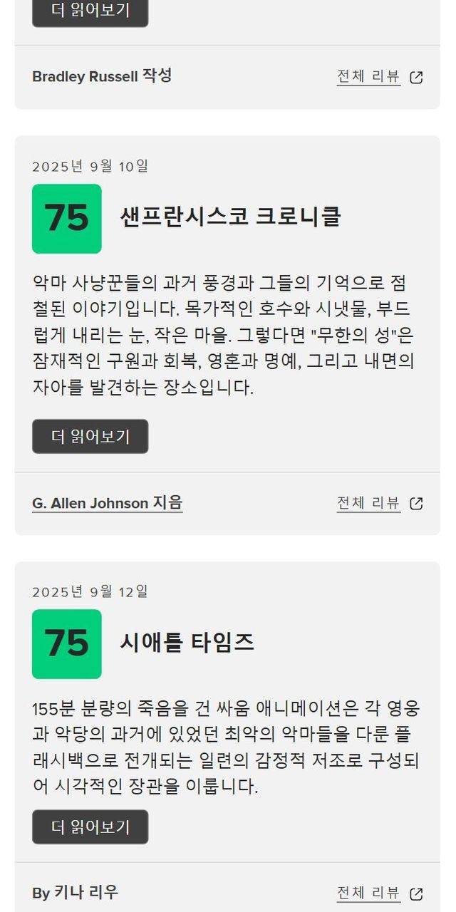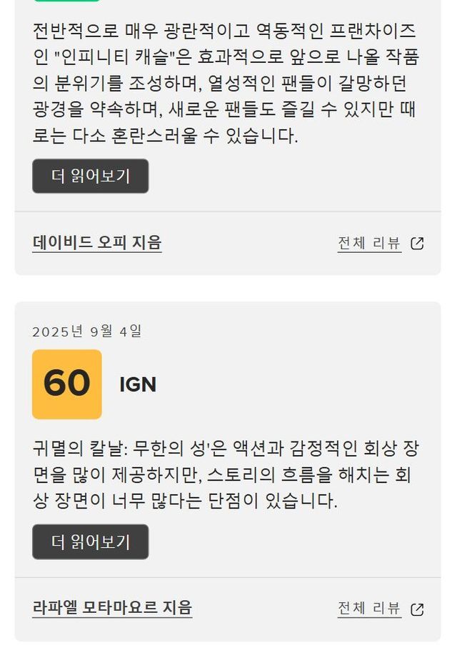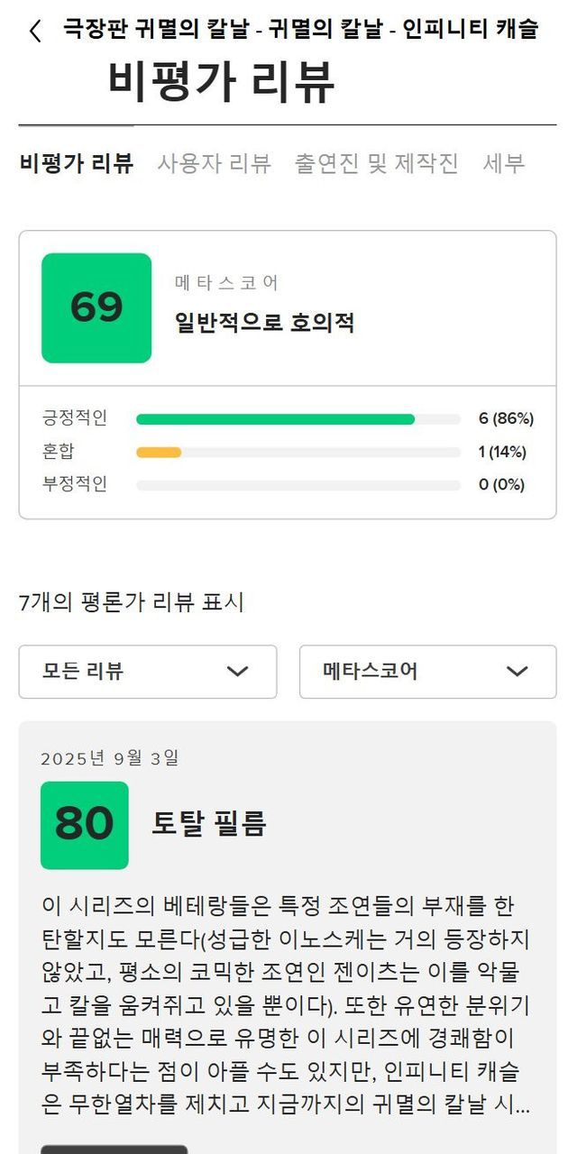 귀멸의 칼날 무한성 메타크리틱 평점