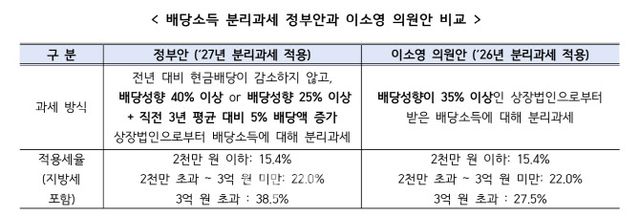 반면 이소영 의원 안은 배당성향 35% 이상인 기업으로부터 개인 배당소득에 최고세율 27.5%로 분리과세 혜택을 부여하는 것이 골자다. 이는 종합과세 최고 실효세율(42.85%)에 비해 15.35%포인트 유리하기에 많은 기업이 배당성향을 35% 이상으로 높일 것이라는 예상이 나온다.