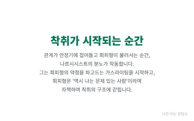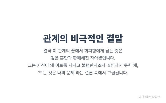 “나는 늘 사람들에게 오해받고 상처받았어”, “나를 온전히 이해해 주는 사람은 너뿐이야”와 같은 말로 회피형에게 접근합니다. 이는 회피형에게 부담스러운 감정적 요구처럼 느껴지지 않으면서, 오히려 자신이 누군가를 돌보고 있다는 우월감과 안정감을 줍니다.