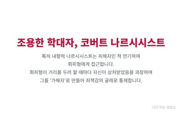 우리가 흔히 아는 외향적이고 과시적인 나르시시스트보다 회피형에게 더 치명적인 유형이 있습니다. 바로 내향적 나르시시스트, 즉 코버트 나르시시스트입니다.