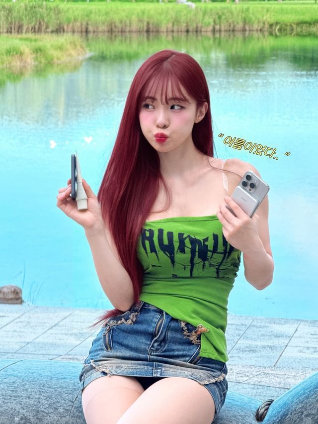공개된 사진 속 그는 새빨간 긴 머리와 초록빛 민소매, 데님 숏팬츠 차림으로 호수 앞에 앉아 포즈를 취하며 시원한 분위기를 자아냈다. 또 앙 다문 입술과 장난스러운 표정으로 팬들의 눈길을 사로잡았다.