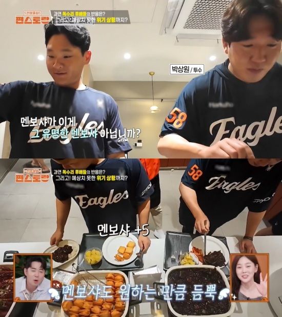 모든 음식이 완성된 후 선수단은 자율배식으로 음식을 가져가기 시작했다. 초반에 입장한 김태연은 멘보샤를 5개 담아갔는데, 이후 다시 멘보샤 앞에 서서 접시 하나에 멘보샤를 모두 담아갔다.
