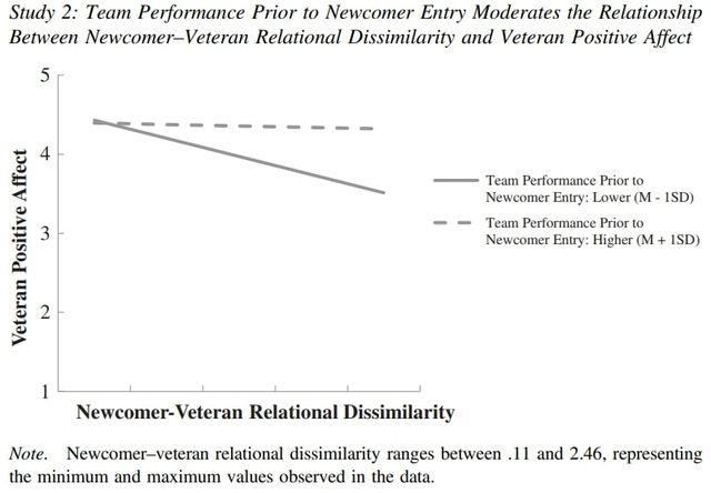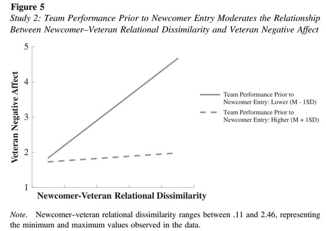 팀 성과가 높은 그룹은 관계적 불일치에 전혀 영향을 받지 않았다. 그러나, 팀 성과가 낮은 그룹은 관계적 불일치 수준이 높을수록 기존 직원들의 부정 정서가 커졌다. 신규 직원이 기존 직원과 성향상 맞지 않아서 문제가 된 그룹은 직전 성과가 나쁜 팀뿐이었다는 것이다. “새로 누가 들어와서 팀 분위기를 흐렸네, 어쨌네”라는 말이 조직에 만연하다면, 팀 성과가 좋지 않아 나빠진 분위기에 덤터기를 씌울 핑곗거리를 신입한테서 찾은 거나 다름없다.