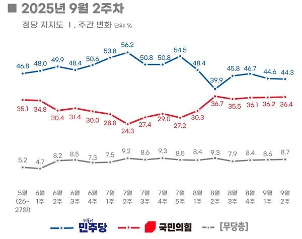 중도층은 민주당이 5.9%P 내리고 국민의힘은 4.0%P 상승하며 민주 43.2%·국힘 33.5%로 집계됐다.