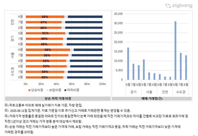 경기·인천은 서울과 달리 흐름이 엇갈렸다. 6월까지만 해도 50% 수준이던 상승 거래 비중이 7월과 8월에는 절반 이하로 떨어졌고, 외곽 지역 중심으로 보합‧하락 거래가 늘었다. 과천과 분당 등 일부 인기 지역은 상승세를 보였지만, 외곽은 약세가 두드러지면서 수도권 내부 온도차가 뚜렷했다.