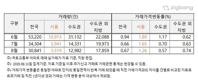 직방이 국토교통부 아파트 매매 실거래가를 분석한 결과, 전국 거래량은 6월 5만3220건에서 △7월 3만4304건 △8월 3만841건으로 두 달 만에 40% 가까이 급감했다. 수도권 역시 같은 기간 3만1132건에서 1만2982건으로 반 토막이 났다. 대책 발표 이후 단기간에 거래 위축이 뚜렷하게 나타난 것이다.