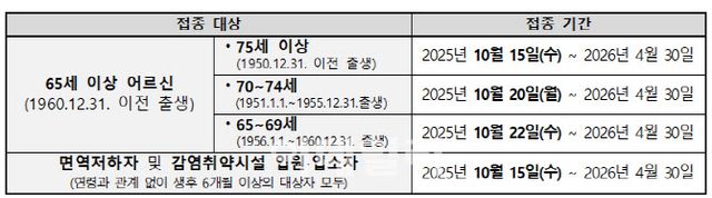 대상별로 65세 이상 어르신의 경우 10월 15일부터 75세 이상(1950년 이전 출생자)을 시작으로 70~74세(1951~1955년 출생)는 10월 20일부터, 65~69세(1956~1960년 출생) 10월 22일부터 등 연령대별 순차적 접종을 시작한다. 생후 6개월 이상 면역저하자와 감염취약시설 입원·입소자도 10월 15일부터 접종을 시작한다.