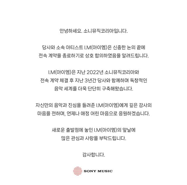 이들은 “I.M(아이엠)은 지난 2022년 소니뮤직코리아와 전속 계약 체결 후 지난 3년간 당사와 함께하며 독창적인 음악 세계를 더욱 단단히 구축해왔다. 자신만의 음악과 진심을 들려준 I.M(아이엠)에게 깊은 감사의 마음을 전하며, 언제나 애정 어린 마음으로 응원하겠다”고 말했다. 그러면서 “새로운 출발점에 놓인 I.M(아이엠)의 앞날에 많은 관심과 사랑을 부탁드린다”고 전했다.