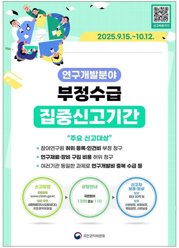 뉴시스 보도에 따르면, 권익위는 이날부터 실시하는 집중 신고 기간 중 신고된 건에 대해서는 해당 신고 사건은 물론, 피신고자가 다른 기관에서 지원받은 연구개발비의 부정수급 여부 등도 종합적으로 조사할 예정이다.