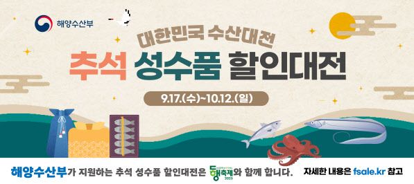 이와 함께 오는 17일부터 내달 12일까지 전국 44개 마트, 온라인몰 등에서 ‘대한민국 수산대전-추석 특별전’을 진행한다. 이번 행사는 대중성 어종(명태, 고등어, 갈치, 오징어, 참조기, 마른멸치 등), 김과 전복, 꽃게, 광어 등 소비자 선호도가 높고 소비촉진이 필요한 수산물을 대상으로 진행하며, 최대 50%까지 할인된 가격으로 수산물을 구매할 수 있다.