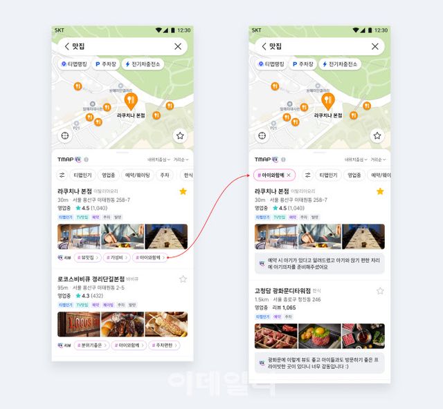 네이버·카카오 등도 비슷한 서비스를 내놓고 있는 가운데 티맵의 차별화 포인트는 운전자 중심 플랫폼으로 ‘찐 리뷰’가 많아 신뢰도가 높다는 점이다. 신 리더는 “운전자들의 취향이 검색 추천과 리뷰에 반영돼 있다”며 “실제 운전자가 주행하고 나서 리뷰를 남기는 구조라 커머스의 구매 인증 리뷰처럼 신뢰도가 높고 본인의 생각과 비슷할 확률도 높다”고 강조했다.