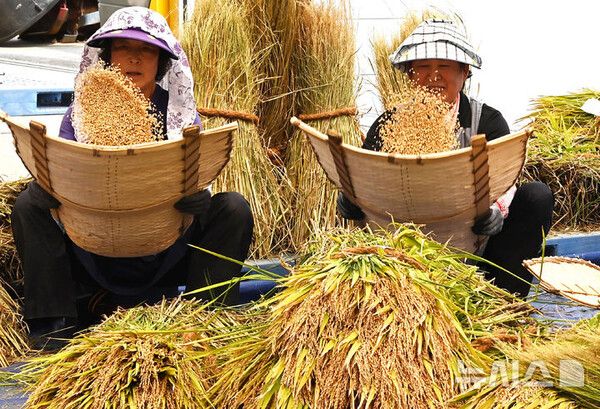 [서울=뉴시스] 아침 저녁으로 선선한 날씨가 이어지고 있는 15일 경기 화성시 경기도농업기술원에서 관계자들이 수확한 연구용 벼를 탈곡한 후 불순물을 걸러내기 위해 키질을 하고 있다.