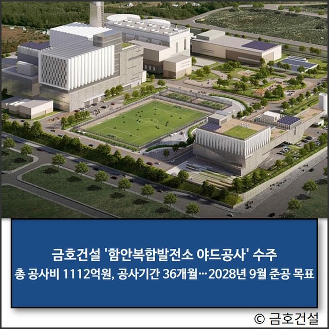 '함안복합발전소 야드건설공사'는 발전소의 안정적 운영을 위해 핵심 부대시설을 통합적으로 구축하는 프로젝트다. 금호건설은 그간 축적한 플랜트 시공 경험과 전문 기술력을 바탕으로 이번 사업을 수행할 예정이다. 총 공사금액은 1112억원이며, 공사기간은 착공 후 36개월로 오는 2028년 9월 준공 예정이다.
