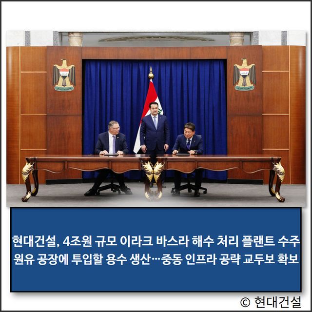 현대건설은 지난 14일(현지시간) 이라크 바그다드에 위치한 이라크 총리실에서 약 30억 달러 규모의 해수공급시설(WIP·Water Infrastructure Project) 프로젝트에 관한 계약을 체결했다고 15일 밝혔다. 이번 플랜트 공사는 이라크 내 △가스 △석유 △태양광 △해수 처리 등 가스 개발 통합 프로젝트의 일환으로 진행됐다.