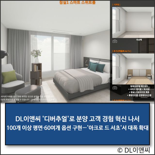 나아가 DL이앤씨는 다음달 서울 서초구에 분양 예정인 '아크로 드 서초'에서 100개 이상의 평면과 3개의 인테리어 스타일, 60여개의 옵션까지 서비스를 대폭 확대한다. 기존보다 훨씬 더 많은 선택지를 제공함으로써 고객 만족도를 크게 높일 것으로 기대된다.