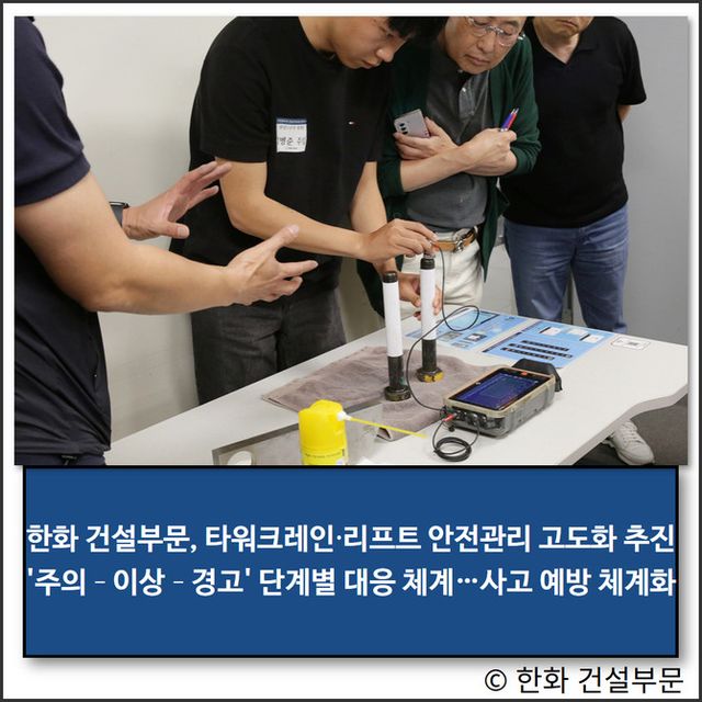 15일 한화에 따르면 이를 위해 국내 IoT 전문기업인 엔키아가 개발한 'WSS(Wirerope Safety Solution)' 스마트 안전진단 장비를 타워크레인 핵심 부품인 와이어로프에 도입하고, 건설기계 전담 인력 교육을 확대하는 등 현장 안전 수준을 강화하고 있다.