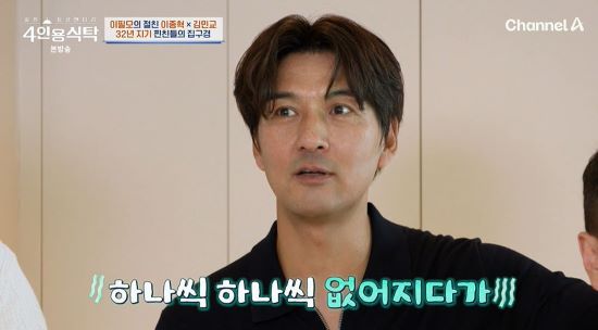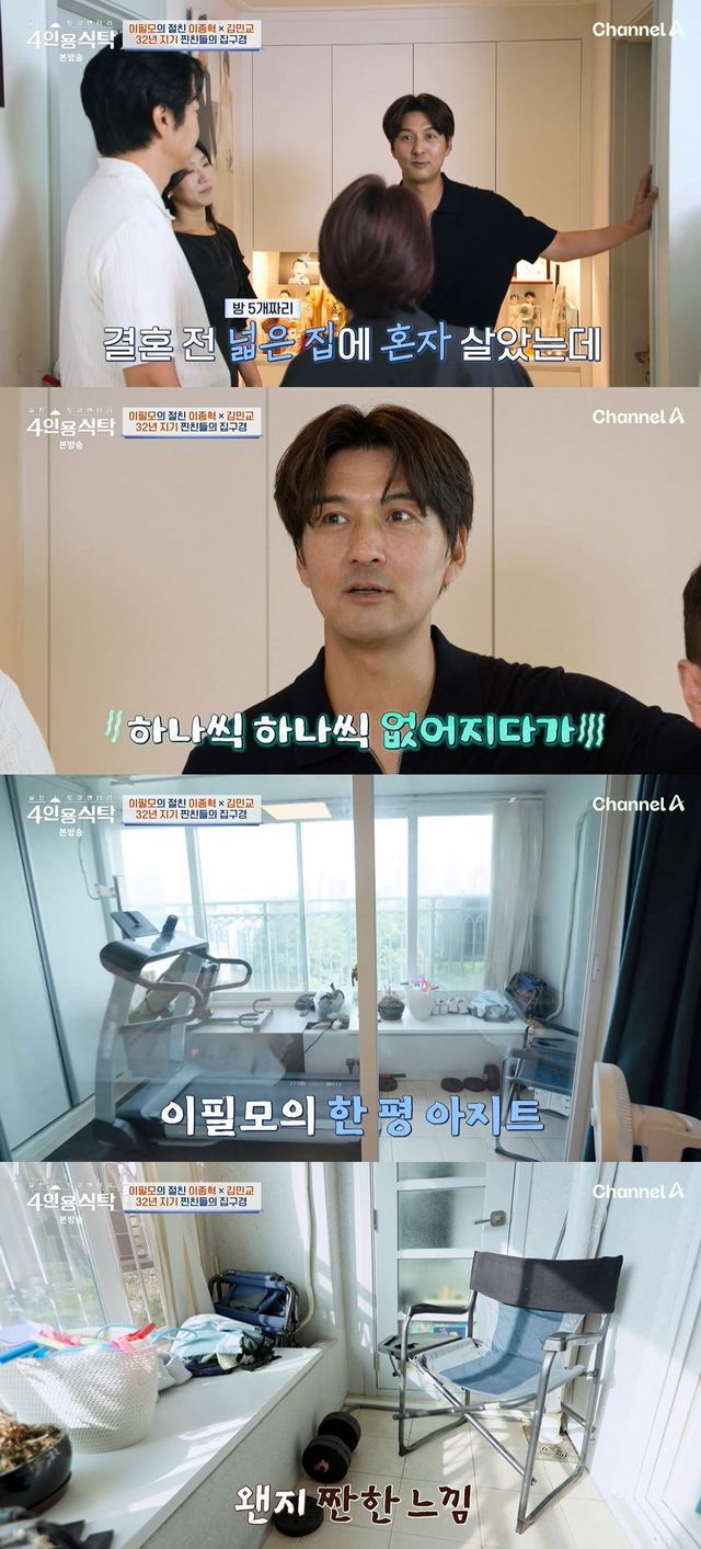 15일 방송된 채널A '절친 토큐멘터리-4인용 식탁'에는 27년 차 배우 이필모가 출연했다. 이날 이필모는 서울예대 93학번 동기이자 32년 지기인 절친 이종혁과 김민교를 집으로 초대했다.