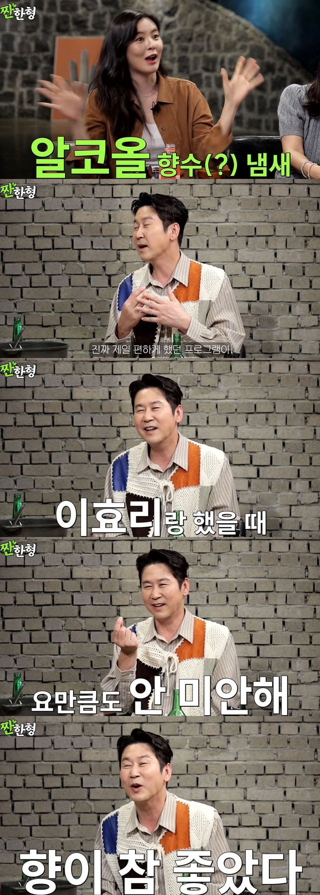 이에 신동엽은 "촬영하기 전날 많이 마실 때가 있다. (양치를) 좀 많이 하고 가글도 많이 하고 향수를 뿌려도 조금씩 눈치가 보일 때가 있다"라고 밝혔다. 그러면서도 "진짜 제일 편하게 했던 프로그램이 있다"라며 궁금증을 유발했다. 신동엽은 "미안해하지 않아도 됐던 프로그램이 이효리랑 했을 때다. 요만큼도(?) 안 미안했다"라며 이효리 역시 촬영하면서 술 냄새가 났다고 폭로했다.