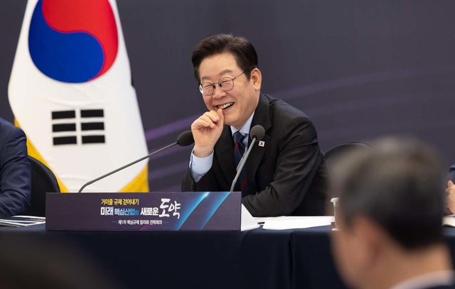 이재명 대통령이 15일 서울 성북구 한국과학기술연구원(KIST)에서 열린 제1차 핵심규제 합리화 전략회의에서 미소를 짓고 있다. / 대통령실 제공