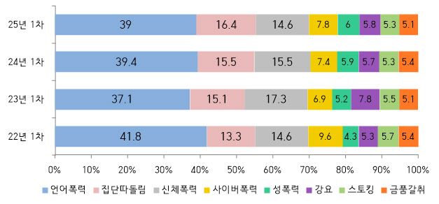 학폭 유형별로는 언어폭력이 39%로 비중이 가장 컸다. 이어 집단따돌림 16.4%, 신체폭력 14.6%, 사이버폭력 7.8%, 성폭력 6% 순이다. 전년과 비교하면 언어폭력과 신체폭력은 각각 0.4%포인트, 0.9%포인트 줄어든 반면 집단따돌림(0.9%포인트), 사이버폭력(0.4%포인트), 성폭력(0.1%포인트) 등은 늘었다.
