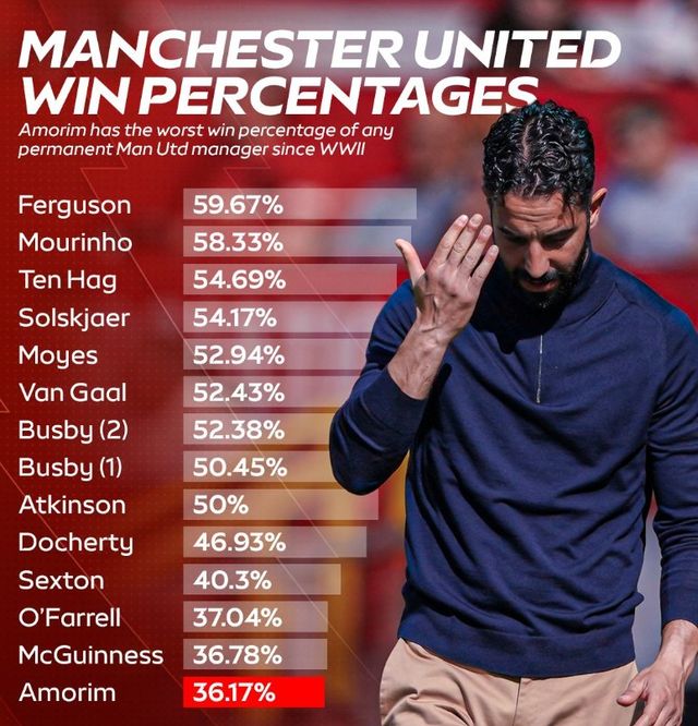 맨유에 부임한 후 무려 2억 5000만 파운드(약 4708억원)를 지출했음에도 아모림 감독의 승률은 2차 세계대전(1939~1945) 이후 맨유 역대 사령탑 중 최저를 기록했다.