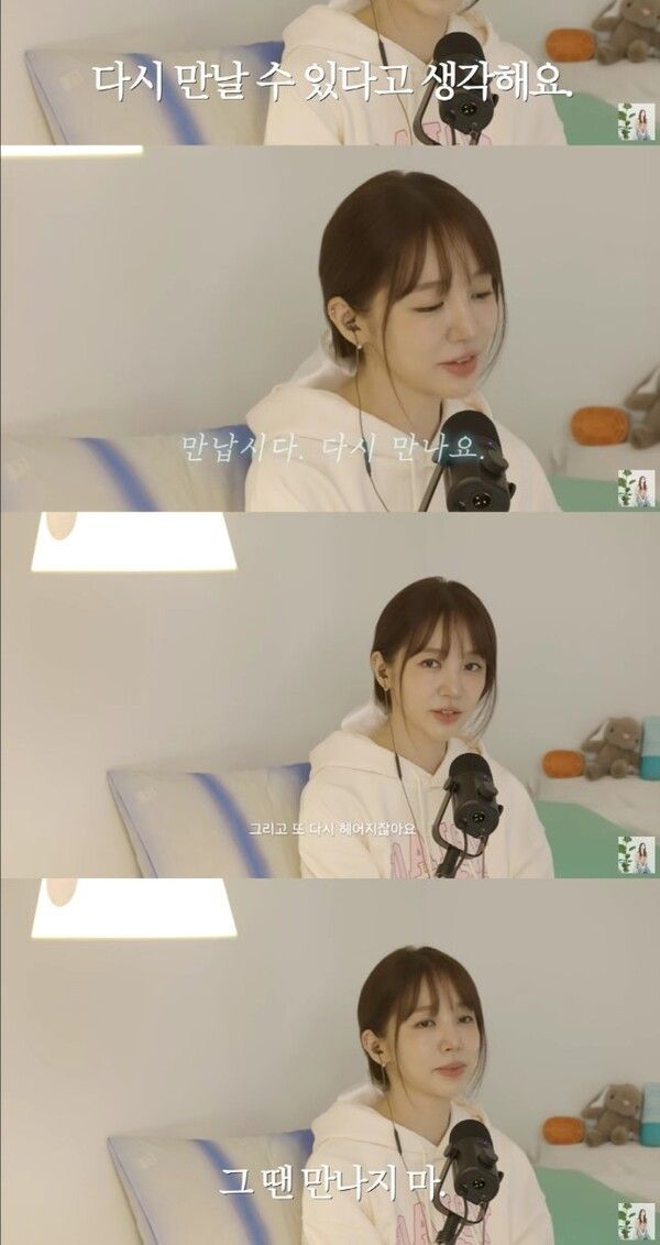 이어 “다시 만나더라도 혹시 또 헤어지게 되더라도 한 번쯤 다시 만나는 것은 괜찮다”며 “그냥 보내주는 게 어디 있냐”고 덧붙여 팬에게 용기를 불어넣었다.