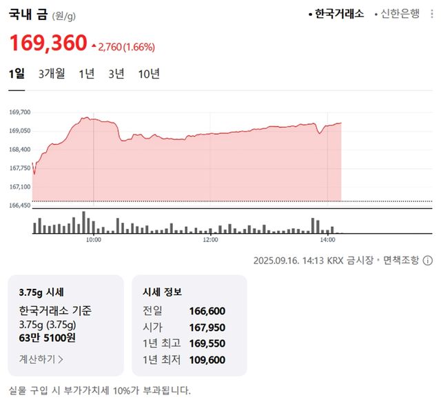 국내 금시세(금값)가 16일(한국 시각) 오후 상승세(전 거래일 대비)를 보이고 있다.