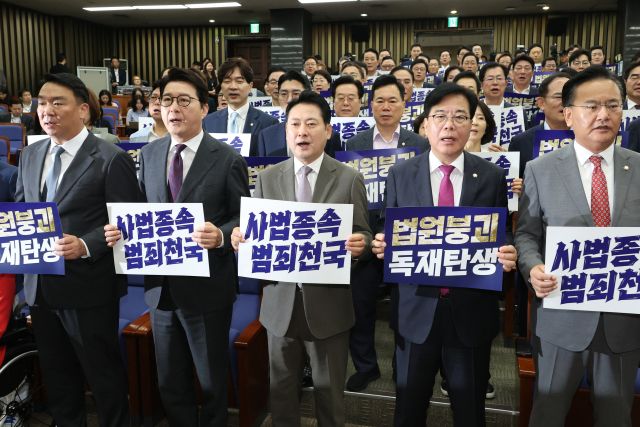 김도읍 정책위의장도 원내대책회의에서 "민주당은 민생은 뒷전이고 인민재판소의 내란특별재판부 설치나 군부독재 시절에도 없었던 대법원장 강제 사퇴에만 매달리고 있다"며 "민생은 방치한 채 범죄 피고인 이재명 한 사람 살리려고 독재체제 구축에만 혈안이 되어 있는 민주당은 국민들의 저항을 마주할 것"이라고 가세했다.