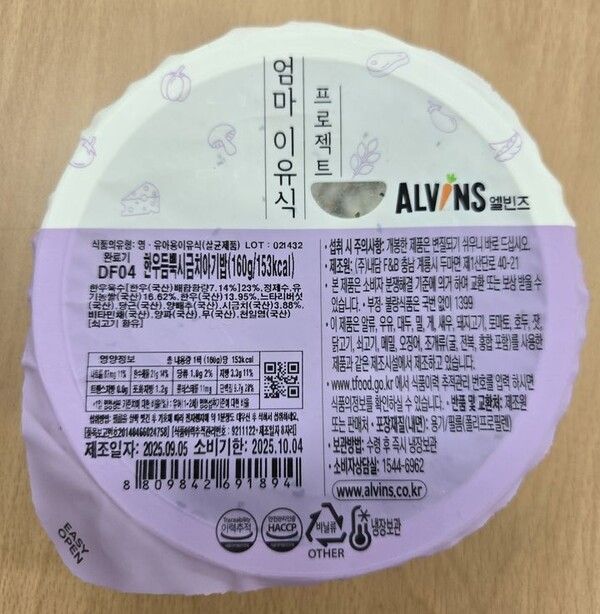 뉴시스 보도에 따르면, 식품의약품안전처는 충남 계룡시 소재 식품제조·가공업체인 '주식회사 내담에프앤비(NAEDAM F&B)'가 제조·판매한 엘빈즈 '한우듬뿍시금치아기밥(식품유 : 영·유아용 이유식)’에서 세균수가 기준치 보다 초과 검출돼 해당 제품을 판매 중단하고 회수 조치한다고 16일 밝혔다.