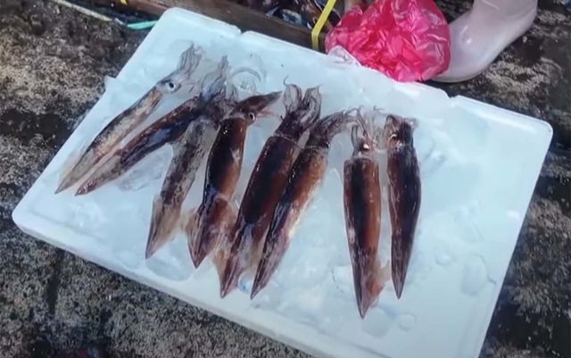 생물 오징어도 인기 품목이다. 초콜릿 색깔이 선명할 정도로 선도가 좋은 오징어를 8마리에 3만원에 팔고 있다.