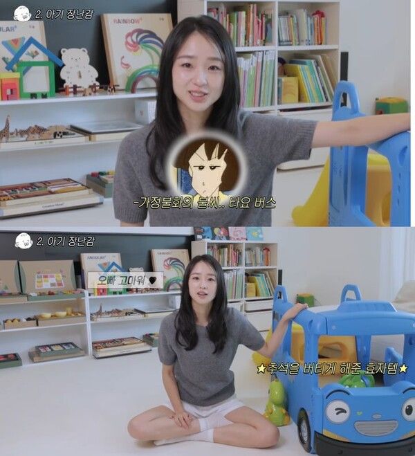 그는 "버스 장난감이 너무 커서 굳이 필요 없으니 사지 말자고 했는데 남편이 그냥 주문해버렸다"고 밝혔다.