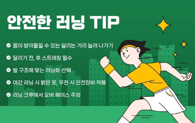 안전하게 러닝을 즐기려면 우선 10% 원칙을 기억하자. 한 주 단위로 운동량을 늘려갈 때 지난주에 달렸던 거리·시간보다 10% 이상 늘리지 않는 것이다. 이번 주에 5㎞를 뛰었다면 다음 주엔 5.5㎞ 이내로 달리는 식이다. 속도보다 거리부터 조금씩 늘려 나간다. 주 3~4회 달리고 근육과 근막이 회복할 휴식일이 필요하다. 미세한 근육통은 냉탕에 들어가면 냉찜질 효과를 볼 수 있다. 또 냉온탕을 번갈아 오가면 혈액순환을 도와 피로회복을 빠르게 한다. 운동 전후 스트레칭도 잊지 말자.
