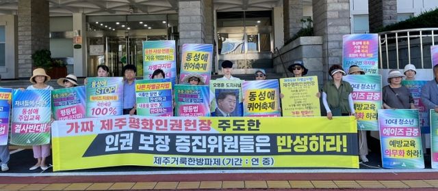 제주거룩한방파제 등 기독교·학부모 단체들은 16일 오전 제주도청 앞에서 기자회견을 열고 제주평화인권헌장 폐기를 촉구했다.