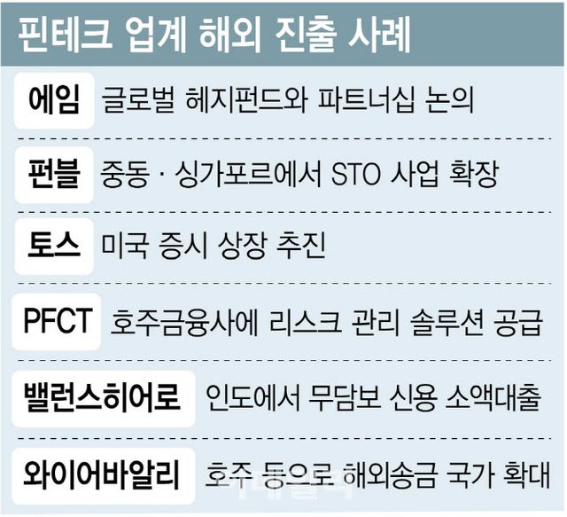 처음부터 글로벌 시장을 염두에 둔 기업도 있다. 금융상품 추천 기업 밸런스히어로는 인도에서 스마트폰 애플리케이션 트루밸런스를 출시하고 신용정보 데이터가 부족한 10억명 이상의 중저신용자들을 위한 무담보 신용 소액대출 서비스를 제공하고 있다. 와이어바알리도 호주에서 해외 송금기업 최초로 현지에서 서비스를 시작해, 한국·뉴질랜드·미국·홍콩·캐나다·베트남 등으로 서비스 국가를 확대했다.