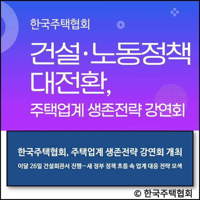 한국주택협회는 오는 26일 논현동 건설회관에서 '건설·노동 정책 대전환, 주택업계의 생존 전략'을 주제로 강연회를 개최한다고 16일 밝혔다. 이번 강연회는 새 정부의 정책 변화에 따른 업계 경영 환경 변화에 대응하기 위한 취지에서 마련됐다.