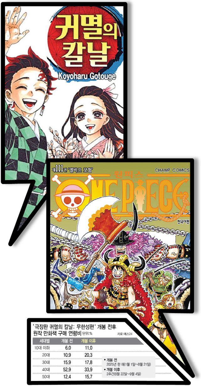권문경 예스24 만화·라이트노벨 PD는 “40대는 수십 년 동안 정상을 지키는 만화책 시리즈의 마니아 세대이자 주 도서 구매층으로 자녀의 만화책까지 함께 구매하는 특성이 있어 전 연령대 중 ‘만화·라이트노벨’ 구매 비율이 가장 높다”고 분석했다. 이어 “1020세대는 웹툰과 영상에 익숙한 세대지만 최근 만화 IP(지적재산권)를 기반으로 한 ‘굿즈’와 팝업스토어 등 팬덤 문화의 주축이 되면서 종이 만화책의 새로운 독자로 떠오르고 있다”고 부연했다.