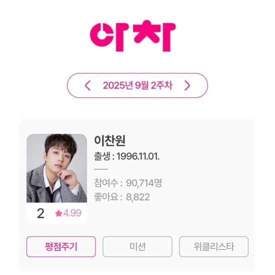 최근 아이돌차트에 따르면, 이찬원은 9월 2주 차 평점랭킹에서 2위를 기록했다.