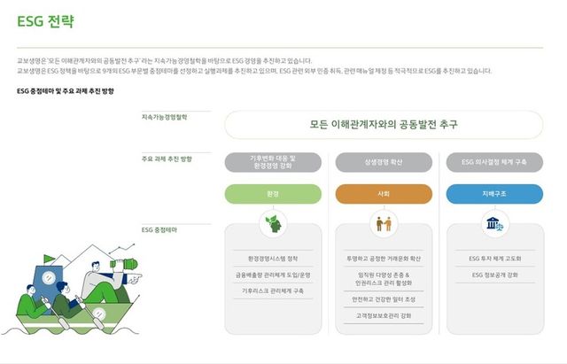 아울러 교보생명은 지배구조의 투명성과 전문성을 높이기 위해 이사회 내 위원회 및 이사 선임 절차를 체계적으로 운영하고 있다. 유엔글로벌콤팩트(UNGC) 회원사로서 국제사회의 ESG 기준인 10대 원칙을 전사 경영에 반영하고 있다. 이사회 내 '지속가능ESG위원회'를 중심으로 ESG 관련 핵심 사안을 논의하며 실행력을 높이고 있다.