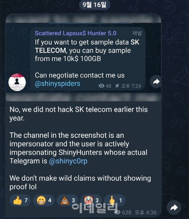 17일 보안업계에 따르면 ‘스캐터드랩서스$’라는 해커집단은 지난 16일 자신의 텔레그램 계정에서 “우리는 올해 초 SK텔레콤을 해킹하지 않았다”며 “(해킹을 주장한) 채널은 모방자”라고 말했다.