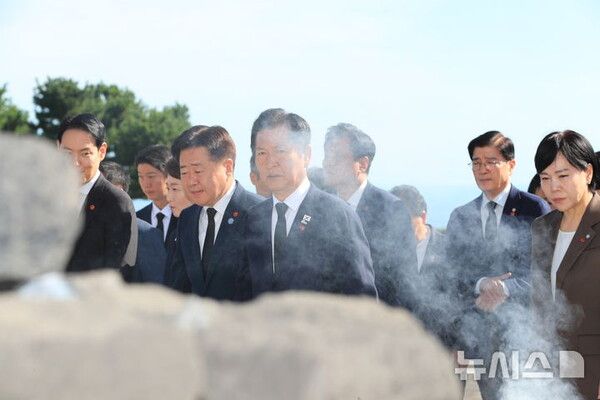 뉴시스 보도에 따르면, 정 대표는 이날 전현희·한준호·김병주·이언주·황명선 등 당 지도부와 함께 제주 4·3 평화공원을 찾아 참배했다. 이들은 모두 4·3사건 상징꽃으로 자리 잡은 동백꽃 배지를 달았다.