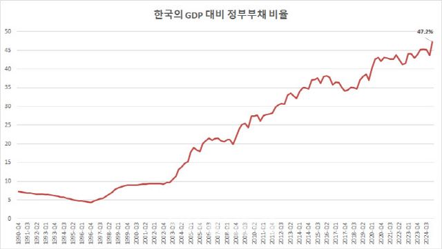 17일 국제결제은행(BIS)에 따르면 올해 1분기 말 한국의 GDP 대비 정부부채 비율은 47.2%를 기록했다. BIS가 우리나라 정부부채 통계를 집계한 1990년 이후 35년 만에 최고치다.