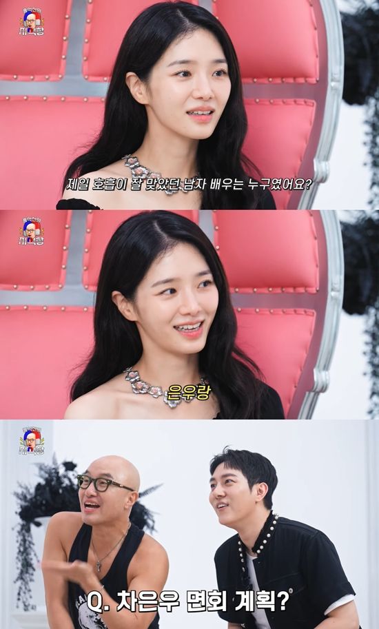 다음 코너로 넘어가 박규영의 필모그래피를 살펴본 두 진행자는 "상대 배역 중 가장 호흡이 잘 맞았던 사람은 누구냐"고 질문했고, 박규영은 "다 잘 맞았는데, 은우랑 찍으면서 많이 친해졌어요. 가장 또래기도 하고..."라며 차은우와의 친분을 밝혔다.