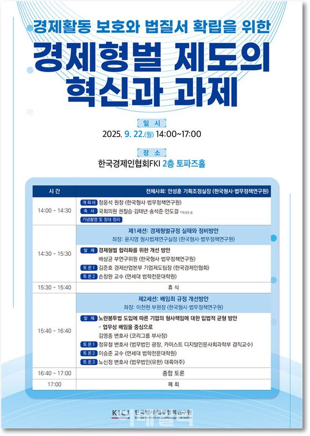 형사·법무정책연구원 관계자는 “이번 세미나를 통해 대통령이 강조한 정책 기조에 부응하며, 경제와 형사정책이 조화를 이루는 합리적 법제도 마련의 필요성을 사회 각계 전문가와 공유하고, 향후 정책적·입법적 제언을 발굴하는 계기를 마련할 계획”이라고 말했다.