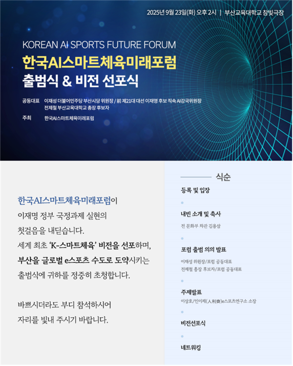 한국AI스마트체육미래포럼이 오는 9월 23일(화) 오후 2시, 부산교육대학교 참빛극장에서 비전 선포식을 열고 공식 출범한다. 이번 포럼은 이재명 정부 국정과제인 e스포츠 진흥재단 및 박물관 부산 설립을 구체화하며, 부산과 대한민국을 글로벌 e스포츠 중심지로 육성하기 위한 첫걸음을 내딛는다.