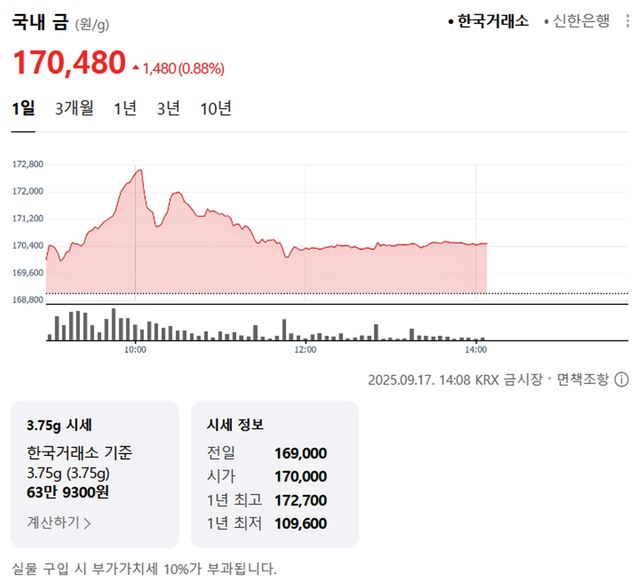 국내 금시세(금값)가 17일(한국 시각) 오후 상승세(전 거래일 대비)를 보이고 있다.