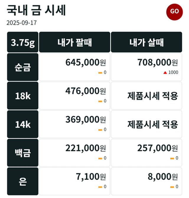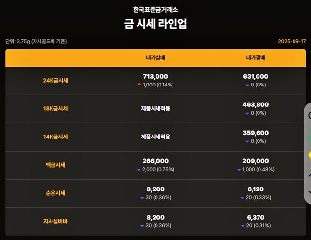 순금(24K) : 매입가 70만 8000원 / 매도가 64만 5000원