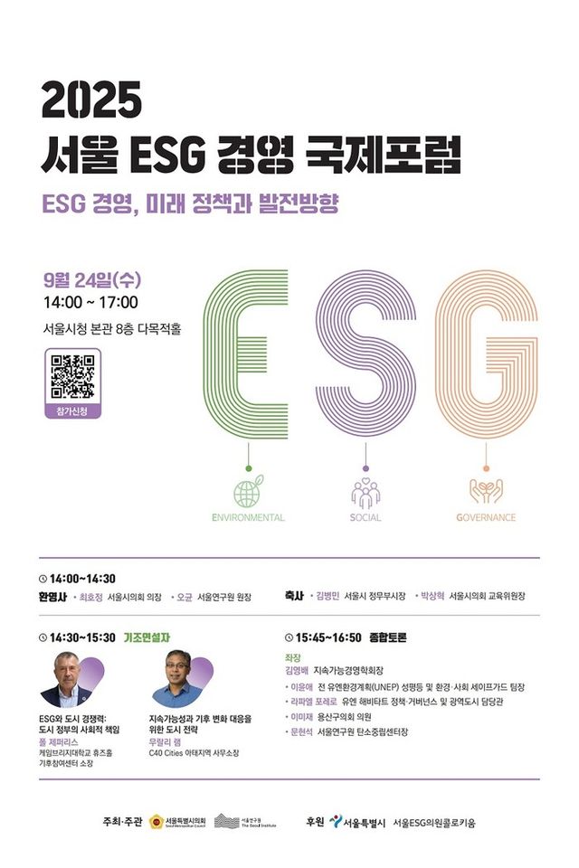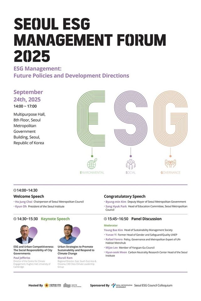 [파이낸셜경제=김영란 기자] 서울연구원(원장 오균)은 9월 24일 오후 2시부터 서울시청 본청 8층 다목적홀에서 ‘ESG 경영, 미래 정책과 발전방향’을 주제로 서울특별시의회와 서울연구원이 공동주최하고, 서울특별시와 서울ESG의원콜로키움이 후원하는 제3회'2025 서울 ESG 경영국제포럼'을 개최한다.