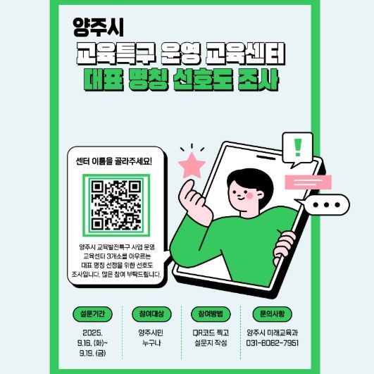 [와이뉴스] 양주시가 교육발전특구 시범지역 사업을 통해 조성한 교육센터의 대표 명칭 선정을 위해 ‘시민이 직접 뽑는 네이밍 선호도 조사’를 오는 19일까지 실시한다.