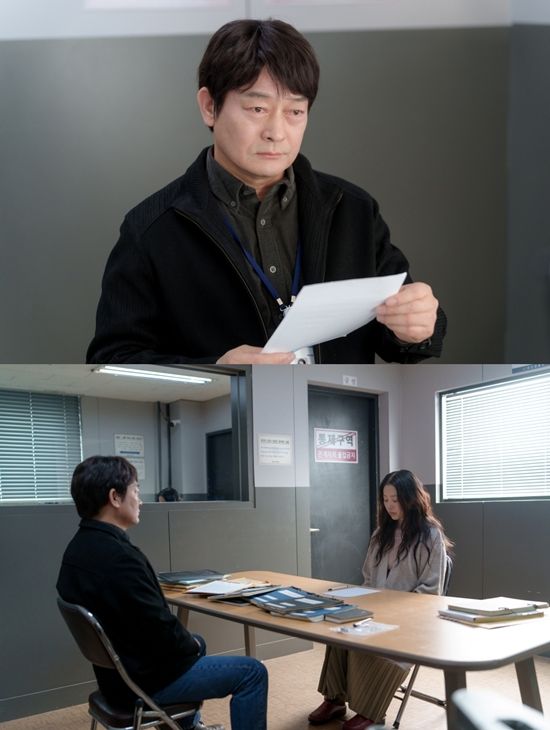 이런 가운데 '사마귀: 살인자의 외출' 제작진이 5회 한 장면을 공개했다. 사진은 23년 전 경찰서에서 마주 앉은 연쇄살인사건 유력 용의자 정이신과 경찰 최중호의 모습을 담고 있다. 정이신은 무표정임에도 어딘지 여유로운 느낌이다. 반면 경찰인 최중호는 사뭇 심각한 표정을 짓고 있으며 눈빛에서는 불안감이 엿보인다. 일반적으로 생각하는 경찰과 유력 용의자의 분위기가 뒤바뀐 듯한 모습이다.