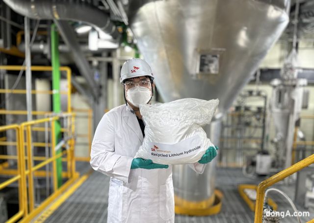 SK이노베이션 환경과학기술원 연구원이 폐배터리 수산화리튬 직접 회수 기술 상업화 실증 설비를 통해 회수한 재활용 수산화리튬을 소개하고 있다.